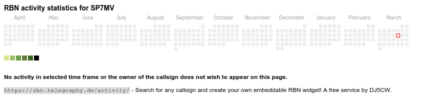 The heatmap shows the activity as reported by the RBN (CW/PSK/RTTY, no FT8) of the last 12 months. You can scroll back to January 2015.