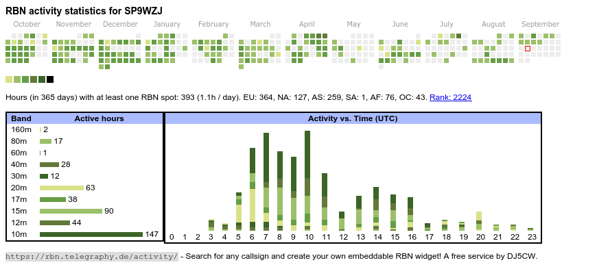 The heatmap shows the activity as reported by the RBN (CW/PSK/RTTY, no FT8) of the last 12 months. You can scroll back to January 2015.