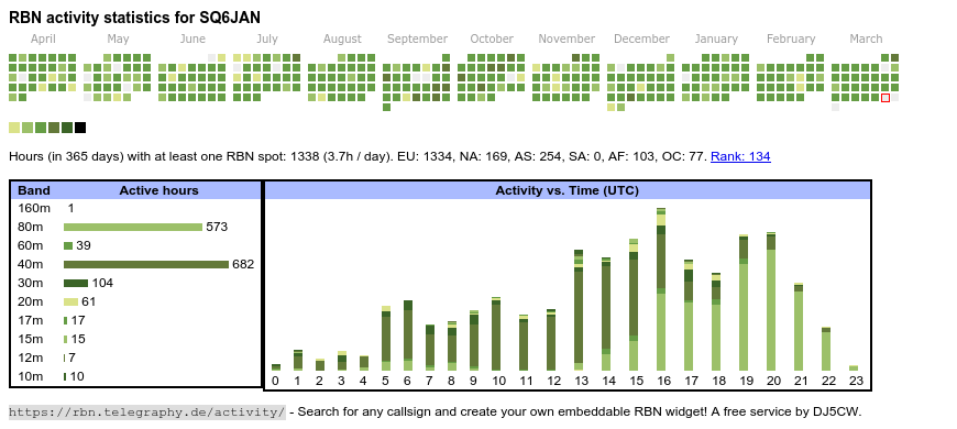 The heatmap shows the activity as reported by the RBN (CW/PSK/RTTY, no FT8) of the last 12 months. You can scroll back to January 2015.