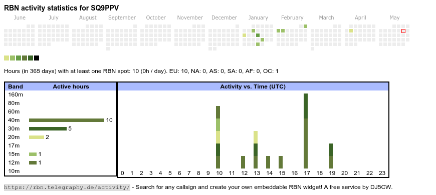 The heatmap shows the activity as reported by the RBN (CW/PSK/RTTY, no FT8) of the last 12 months. You can scroll back to January 2015.