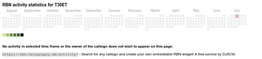 The heatmap shows the activity as reported by the RBN (CW/PSK/RTTY, no FT8) of the last 12 months. You can scroll back to January 2015.