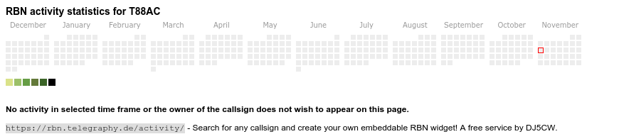 The heatmap shows the activity as reported by the RBN (CW/PSK/RTTY, no FT8) of the last 12 months. You can scroll back to January 2015.