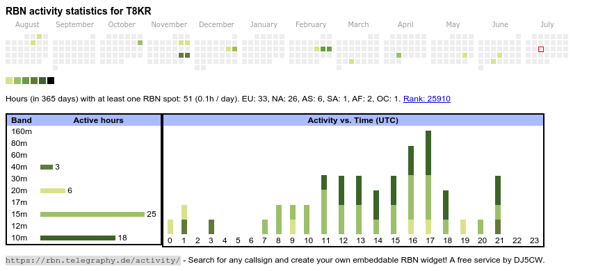 The heatmap shows the activity as reported by the RBN (CW/PSK/RTTY, no FT8) of the last 12 months. You can scroll back to January 2015.