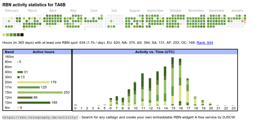 The heatmap shows the activity as reported by the RBN (CW/PSK/RTTY, no FT8) of the last 12 months. You can scroll back to January 2015.