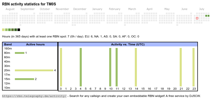 The heatmap shows the activity as reported by the RBN (CW/PSK/RTTY, no FT8) of the last 12 months. You can scroll back to January 2015.