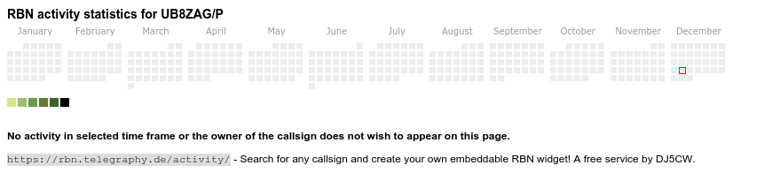 The heatmap shows the activity as reported by the RBN (CW/PSK/RTTY, no FT8) of the last 12 months. You can scroll back to January 2015.