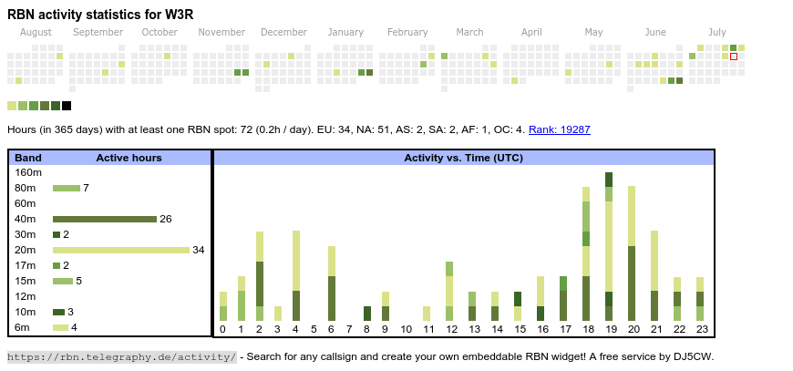 The heatmap shows the activity as reported by the RBN (CW/PSK/RTTY, no FT8) of the last 12 months. You can scroll back to January 2015.