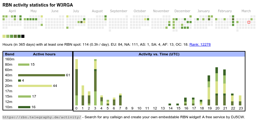 The heatmap shows the activity as reported by the RBN (CW/PSK/RTTY, no FT8) of the last 12 months. You can scroll back to January 2015.