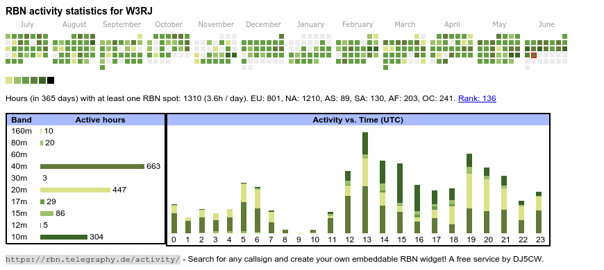The heatmap shows the activity as reported by the RBN (CW/PSK/RTTY, no FT8) of the last 12 months. You can scroll back to January 2015.