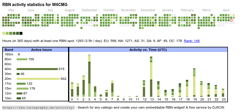 The heatmap shows the activity as reported by the RBN (CW/PSK/RTTY, no FT8) of the last 12 months. You can scroll back to January 2015.
