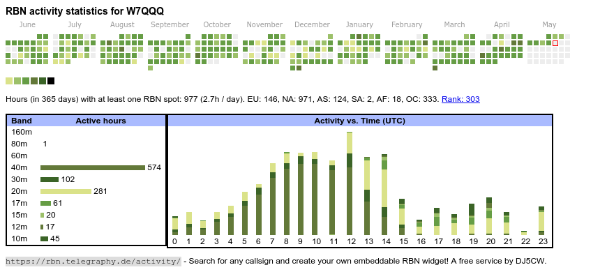 The heatmap shows the activity as reported by the RBN (CW/PSK/RTTY, no FT8) of the last 12 months. You can scroll back to January 2015.