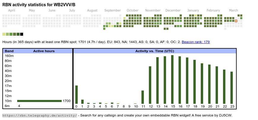 The heatmap shows the activity as reported by the RBN (CW/PSK/RTTY, no FT8) of the last 12 months. You can scroll back to January 2015.