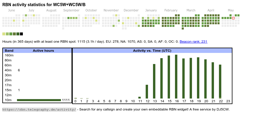 The heatmap shows the activity as reported by the RBN (CW/PSK/RTTY, no FT8) of the last 12 months. You can scroll back to January 2015.