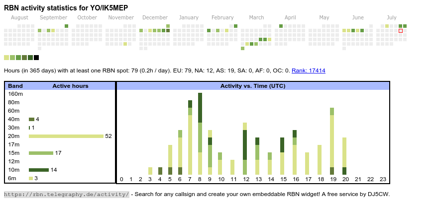 The heatmap shows the activity as reported by the RBN (CW/PSK/RTTY, no FT8) of the last 12 months. You can scroll back to January 2015.