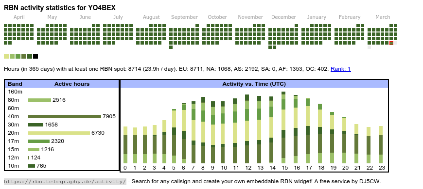 The heatmap shows the activity as reported by the RBN (CW/PSK/RTTY, no FT8) of the last 12 months. You can scroll back to January 2015.