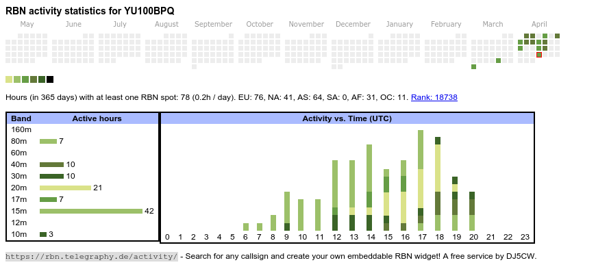 The heatmap shows the activity as reported by the RBN (CW/PSK/RTTY, no FT8) of the last 12 months. You can scroll back to January 2015.