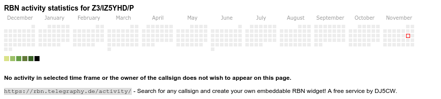 The heatmap shows the activity as reported by the RBN (CW/PSK/RTTY, no FT8) of the last 12 months. You can scroll back to January 2015.
