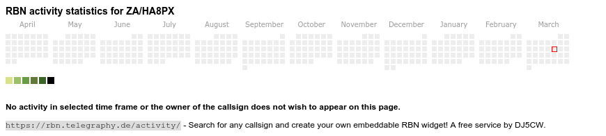 The heatmap shows the activity as reported by the RBN (CW/PSK/RTTY, no FT8) of the last 12 months. You can scroll back to January 2015.