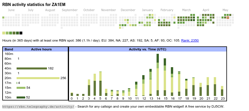 The heatmap shows the activity as reported by the RBN (CW/PSK/RTTY, no FT8) of the last 12 months. You can scroll back to January 2015.