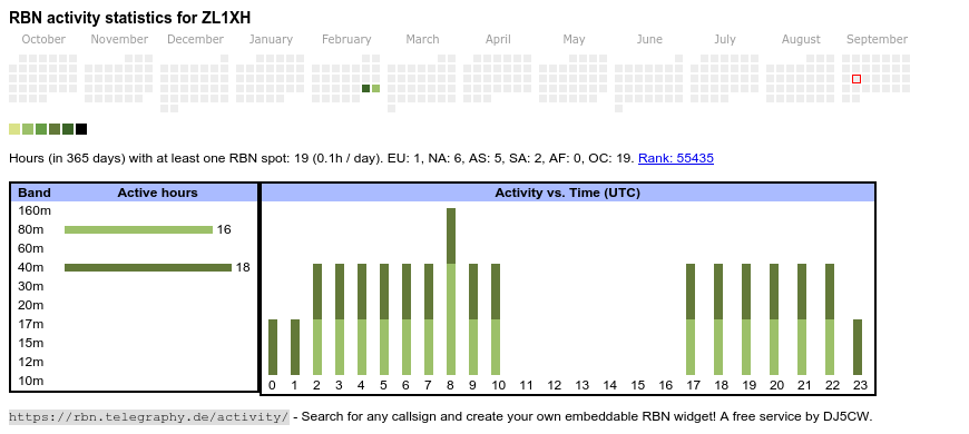 The heatmap shows the activity as reported by the RBN (CW/PSK/RTTY, no FT8) of the last 12 months. You can scroll back to January 2015.