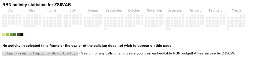 The heatmap shows the activity as reported by the RBN (CW/PSK/RTTY, no FT8) of the last 12 months. You can scroll back to January 2015.